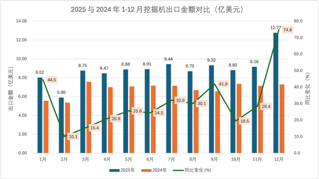 मासिक डेटाबाट, क्रलर उत्खननकर्ताहरूको निर्यात प्रदर्शनले समग्र बजारसँग नजिकबाट पङ्क्तिबद्ध गर्दछ, डिसेम्बरमा एकल-महिनाको निर्यात मूल्य $१.२२८ बिलियनको साथ, वार्षिक रूपमा ७४.०% वृद्धि, र ३४,००० एकाइहरूको निर्यात मात्रा, वर्ष-दर-वर्ष ६५.०% माथि, उल्लेखनीय वर्ष-अन्त गतिमा प्रदर्शन गर्दै। वर्ष-दर-वर्ष परिवर्तनहरूको सन्दर्भमा, निर्यात मूल्य र भोल्युम दुवैले सबै महिनाहरूमा सकारात्मक वृद्धि हासिल गर्यो, सेप्टेम्बरको मात्रा 57.9% ले बढ्यो र डिसेम्बरको मूल्य 74.0% ले बढ्यो, जुन वर्षको वृद्धिको मुख्य विशेषताहरूका रूपमा खडा भयो।