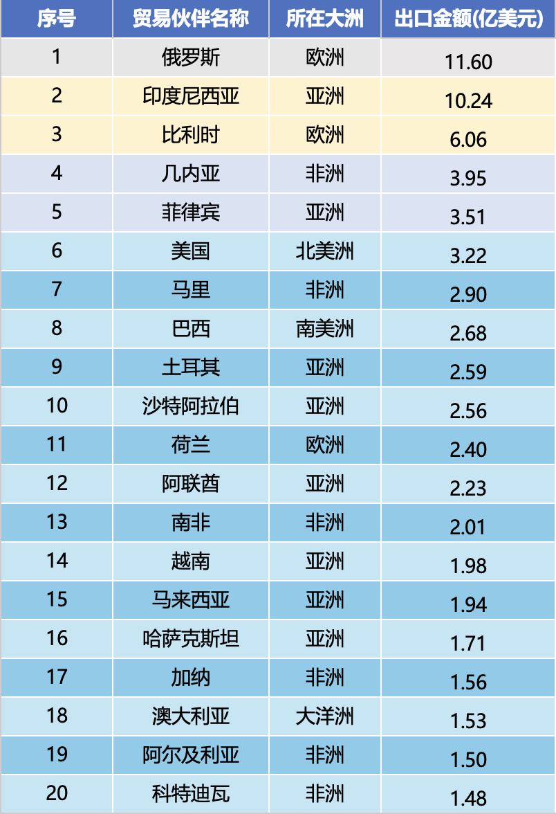 जनवरी देखि डिसेम्बर 2025 सम्मको निर्यात रकमको रैंकिंगमा शीर्ष दस व्यापार साझेदारहरू रूस ($ 1.16 बिलियन), इन्डोनेसिया ($ 1.024 बिलियन), बेल्जियम ($ 606 मिलियन), गिनी ($ 395 मिलियन), फिलिपिन्स ($ 351 मिलियन), संयुक्त राज्य अमेरिका ($ 322 मिलियन), माली ($ 290 मिलियन), ब्राजिल ($ 290 मिलियन) छन्। ($259 मिलियन), साउदी अरब ($256 मिलियन)। शीर्ष दस बजारहरूको कुल निर्यात मूल्य 4.93 बिलियन अमेरिकी डलर पुगेको छ, जुन कुल निर्यात मूल्यको 45.9% हो, कोर बजारमा उच्च एकाग्रताको साथ।