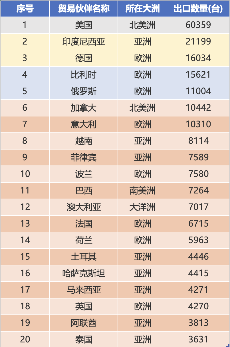 रकमको हिसाबले क्रमबद्धताको तुलनामा, संयुक्त राज्य अमेरिका 60000 एकाइ भन्दा बढीको निर्यात मात्राको साथ धेरै अगाडि छ, दोस्रो स्थानमा रहेको इन्डोनेसियाको 2.8 गुणा, र यसको आर्थिक बजार विशेषताहरू हाइलाइट गर्दै प्रति एकाइ $ 5000 को एक इकाई मूल्य; युरोपेली बजारको प्रदर्शन प्रभावशाली छ, जर्मनी, बेल्जियम, रसिया, इटाली र पोल्याण्ड सबै शीर्ष दसमा छन्, कुल निर्यात परिमाण 61000 इकाइहरू छन्, जुन शीर्ष दस बजारहरूको कुल मात्राको 36.0% हो, जसले युरोपेली बजारमा चिनियाँ उत्खननकर्ताहरूको ठूलो मात्रामा मागलाई प्रतिबिम्बित गर्दछ। एसियामा इन्डोनेसिया, भियतनाम र फिलिपिन्सले 37000 इकाइहरूको कुल निर्यात परिमाणको साथ स्थिर माग मापन कायम राखेका छन्, मात्रा पक्षको लागि महत्त्वपूर्ण समर्थन बनेको छ।